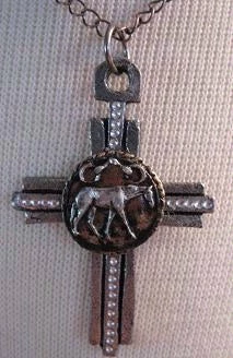 Pleasure Horse of lead free pewter is on the center of this unique cross. Cross is 2.5 inches long by 1.5 inch across. Diamond cut on cross gives it shine. On antiqued copper chain 22 inches adjustable to any length.