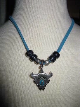 Handcrafted by the folks at Kraftworks Studio, a family owned craft studio, established in 1979, located in rural West Virginia. Each item features their own exclusive beautifully cast lead-free steer skull charm that has been sterling silver plated. Features beads, suspended on 20″ blue leather thong. Lobster claw clasp. Unisex. Handmade in the USA.