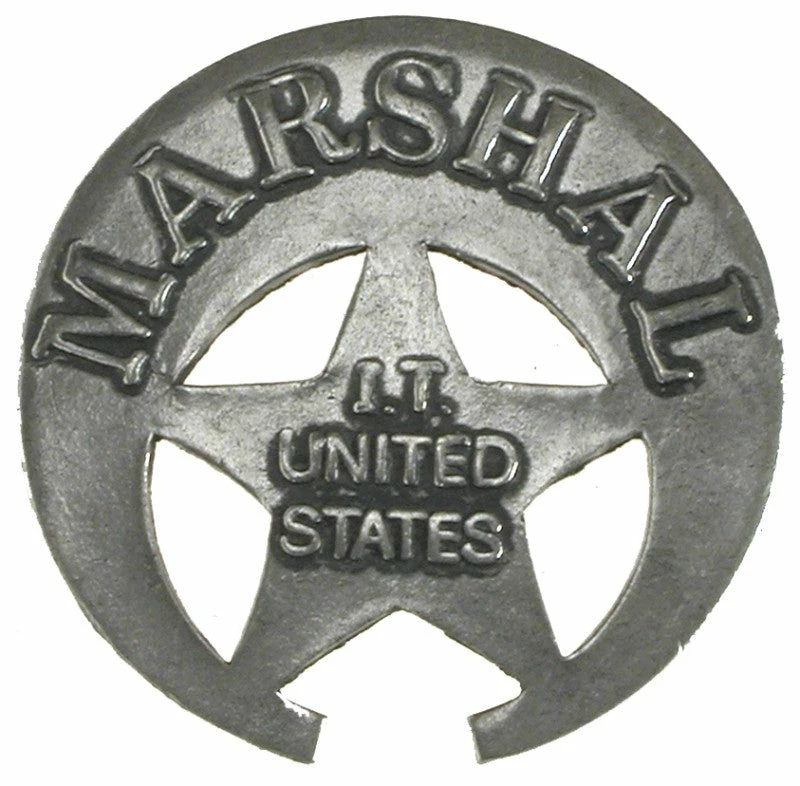 - Old West, historic Marshal Indian Territory badge measures approximately 1.5″H x 1.5″W