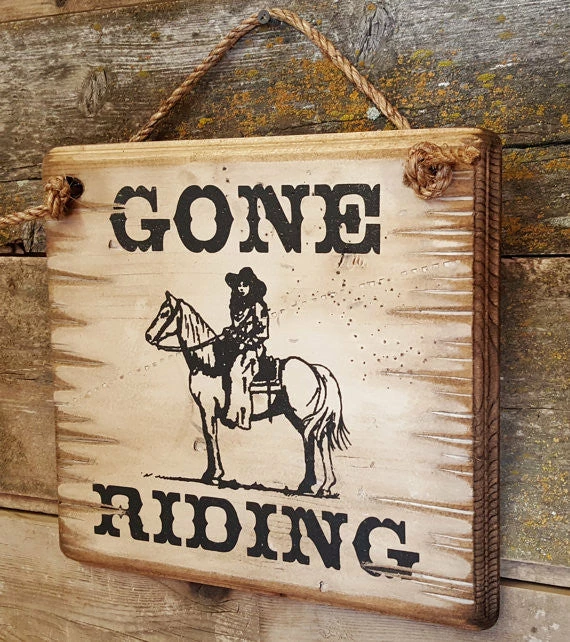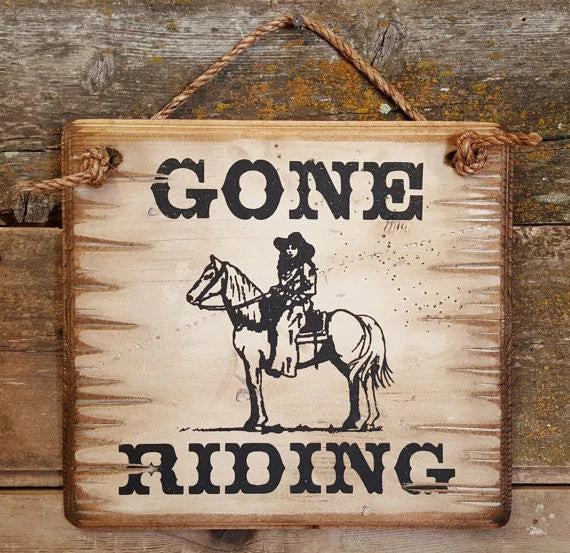 This sign, with horse and rider, will tell everyone where you want to be! This white background sign measures 12×12 handcrafted with pride!!