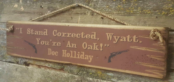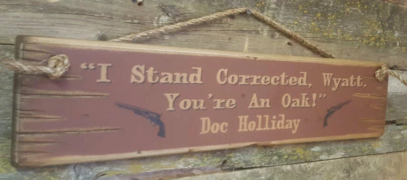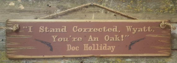 Famous quote delivered by actor Val Kilmer as Doc Holliday in the movie, “Tombstone.” Spoken to Wyatt Earp when he refused to dance with Josephine Marcus. Western handmade sign of pine and distressed to look “Old West,” measures 24″w x 5.5″h