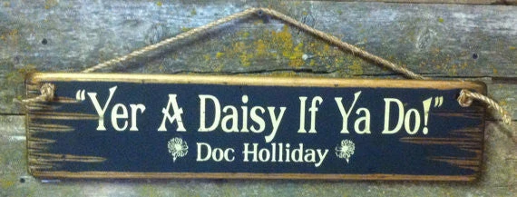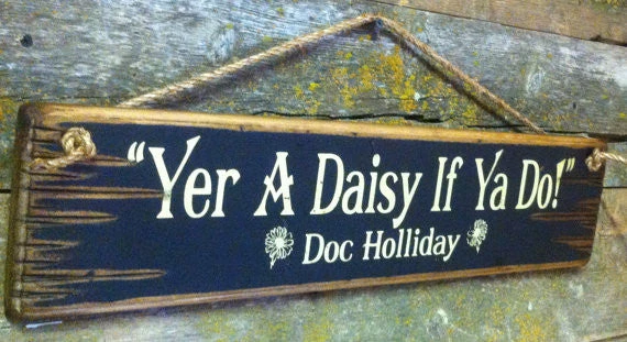Famous quote delivered by actor Val Kilmer portraying Doc Holliday in the movie, “Tombstone.” Western handmade sign of pine and distressed to look “Old West,” measures 24″w x 5.5″h