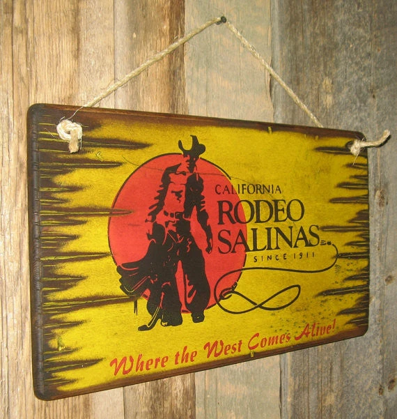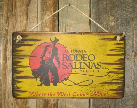 Handmade of pine and distressed to look weathered, this Western sign features the classic California Salinas Rodeo logo. Measures 19″w x 11″h