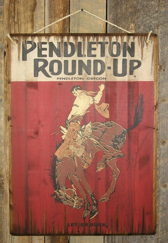 Handmade of pine and distressed to look weathered, this Western sign features the classic Pendleton Round-Up logo. Measures 22″w x 30″h.