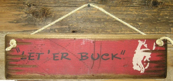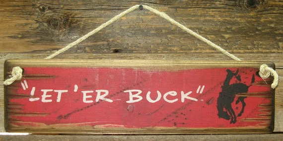 Handmade of pine and distressed to look weathered, this sign is a replica of the famous tag line, “Let’Er Buck” with red background, black bronc, and white letters.
