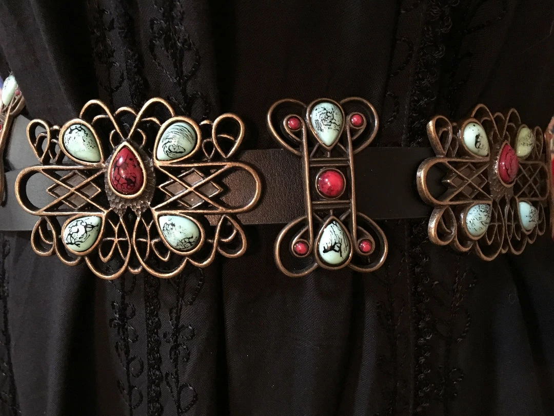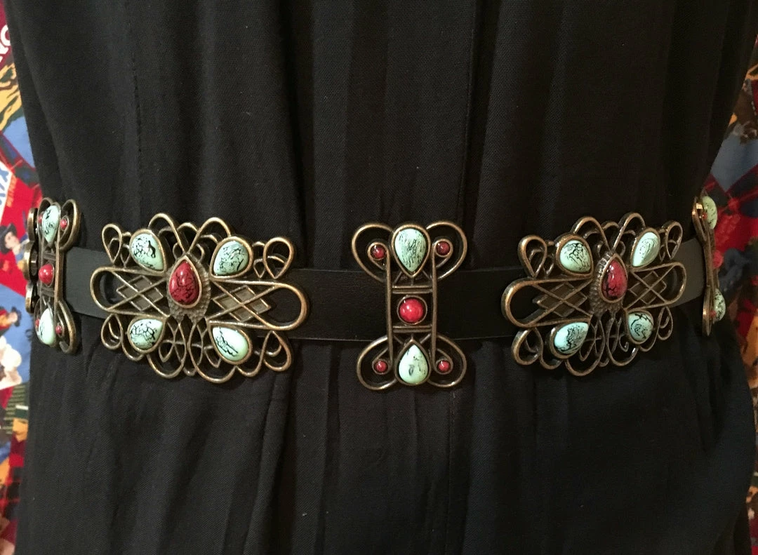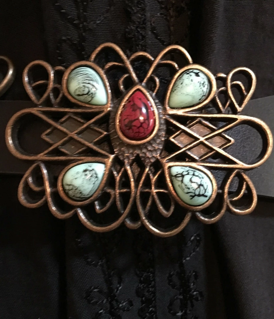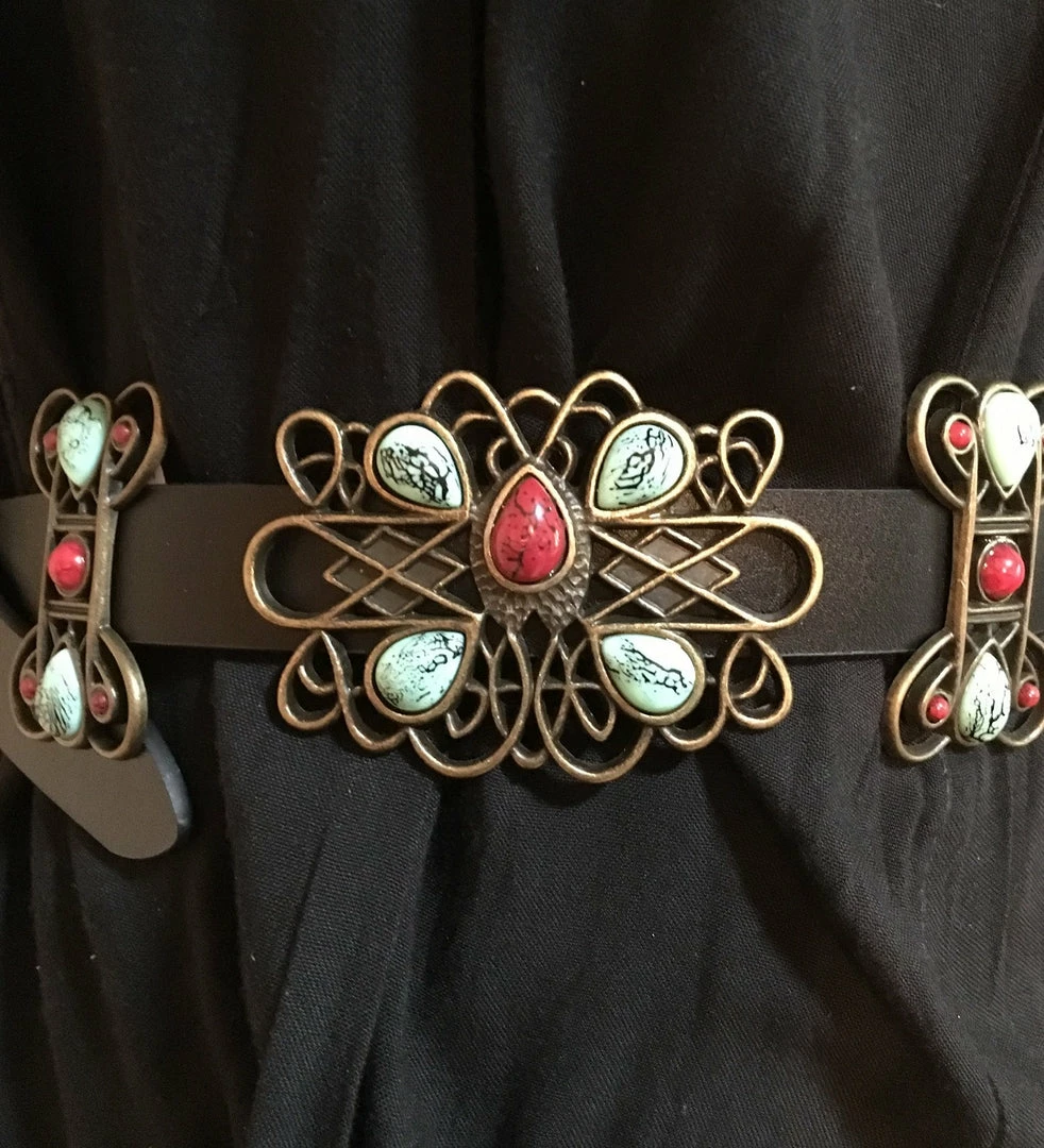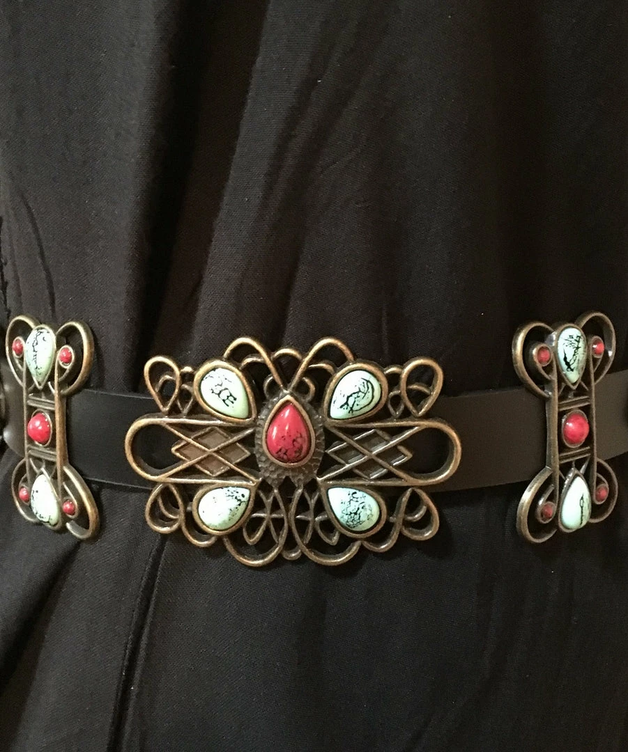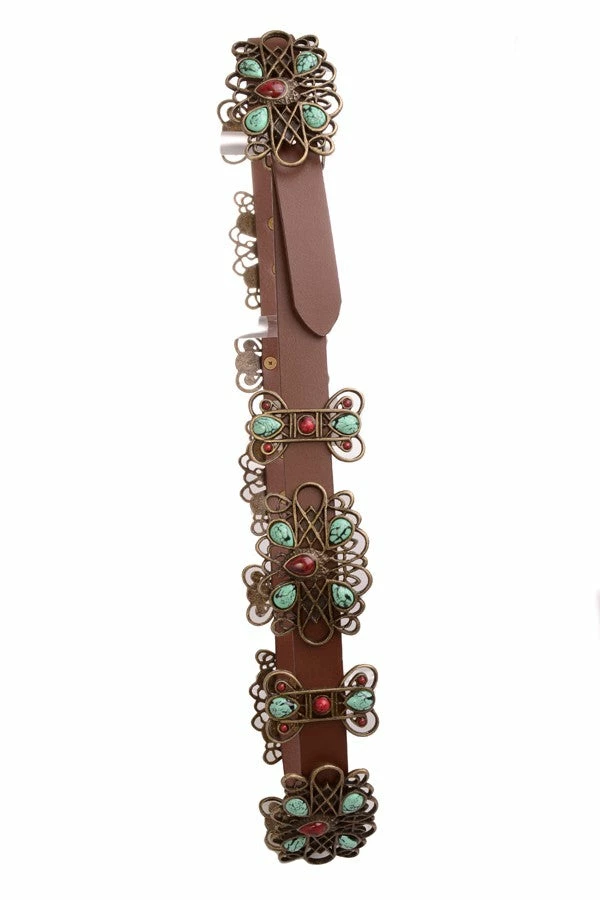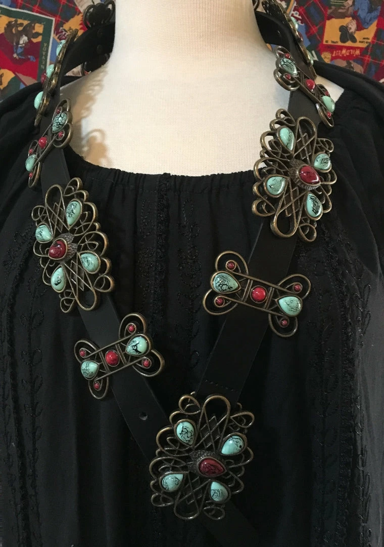 - Copper colored decorative conchos accented with faux turquoise and coral stones