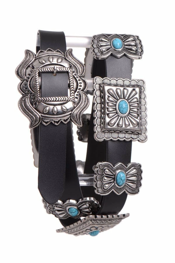 Classic Southwest style leather belt adds a touch of the West to your everyday wardrobe. Strap is 1″ wide in black genuine leather. Individual rectangular conchos are secured and cannot be adjusted – each is 2.75″ x 2.25.” Matching square buckle is 3″ x 3.” Conchos are antiqued silver tone with faux turquoise stones on black.
