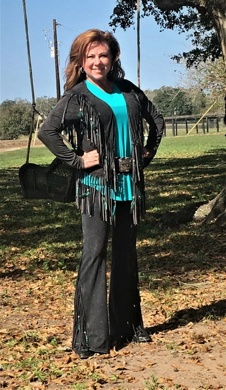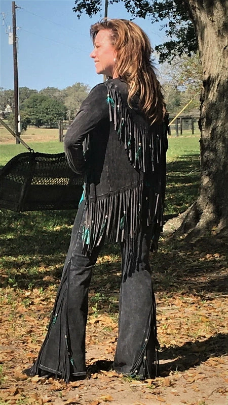 The look of leather with lots of flash and dash, this striking and comfortable yoga style flared bottom, boot cut pant of distressed black has silver tone beads, feathers, and fringe.