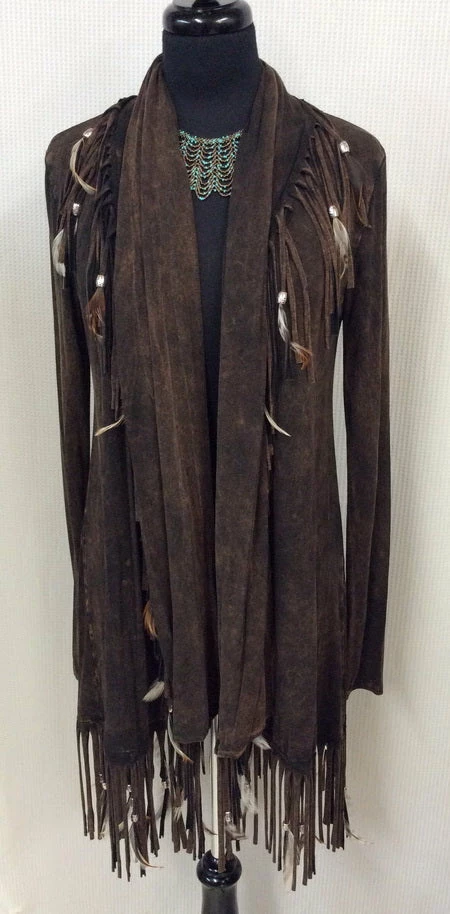Stunning distressed brown Jacket is fringed, beaded, and feathered and looks great over everything from jeans to matching fabric styles. Easy to wear fabric with a touch of lycra.