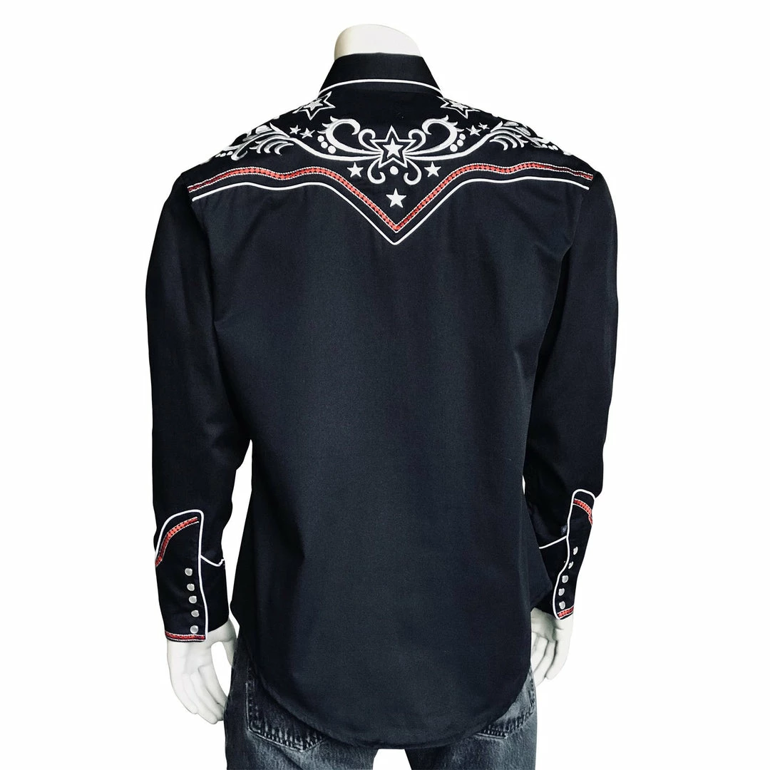 This ornate embroidered shirt is extremely high quality with fine detailing and special techniques on front, back and cuffs. Star and Scroll design on yokes and cuffs. Note the Red border stitch embroidery tracing the piping, the yoke contour, and cuff border. Special features include piping, embroidered pointed ends on the smile pockets, Rockmount’s cuffs, pearl round snaps. Fabric is year-round weight 100% gabardine twill. Rockmount vintage embroideries are natural 100% cotton that is more comfortable and ages well.