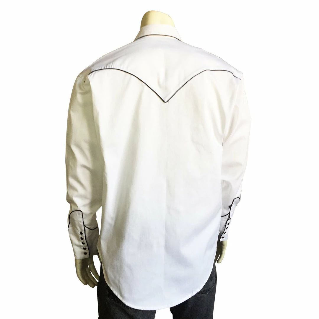 - Black piping on collar, yokes, cuffs