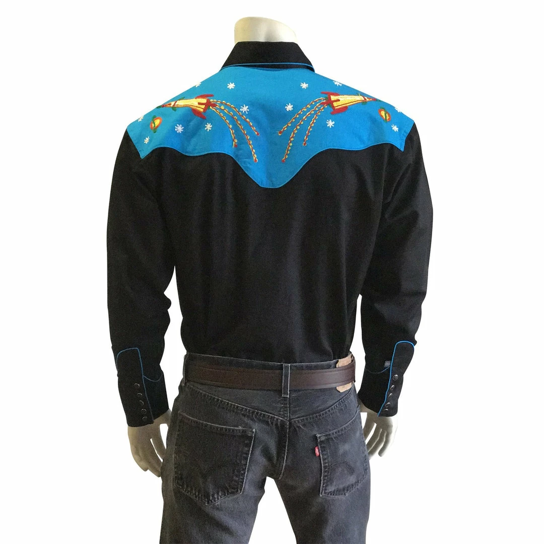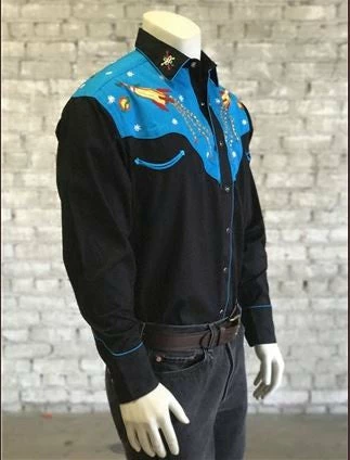 Rockmount calls this hip design the “Space Cowboy with Rockets,” inspired by Flash Gordon meeting Trigger. (Some rockets are fueled by oats!) Their top vintage construction of black body with turquoise yoke features: