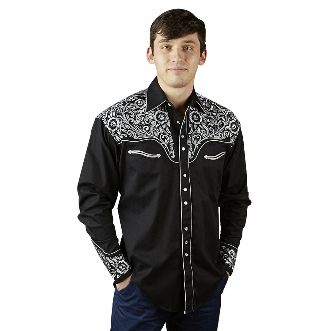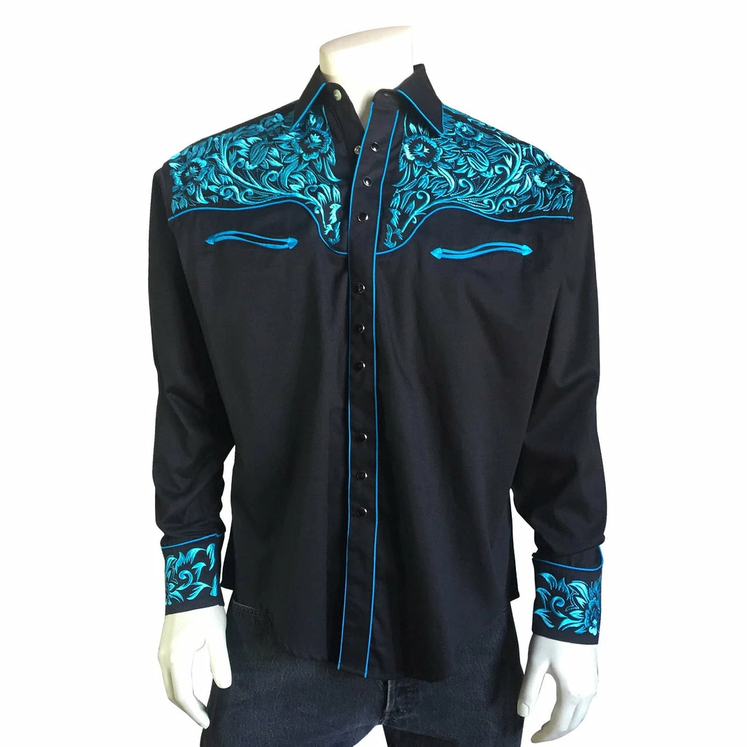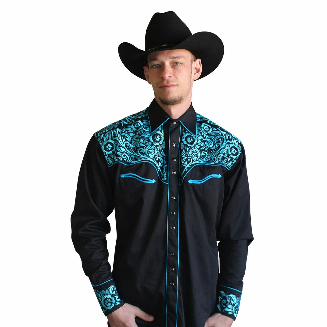 Fine Western embroidery and Rockmount … pure Americana. Rockmount’s embroidery is a tribute to classic floral saddle tooling on front, back and cuffs. The fabric is 100% cotton gabardine twill.