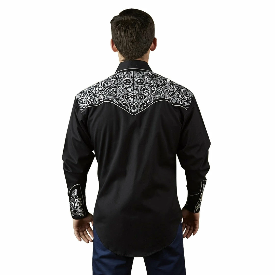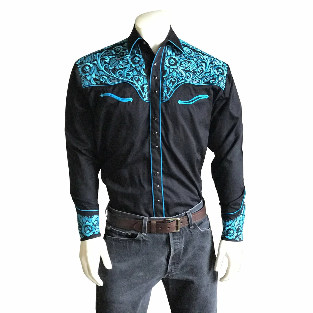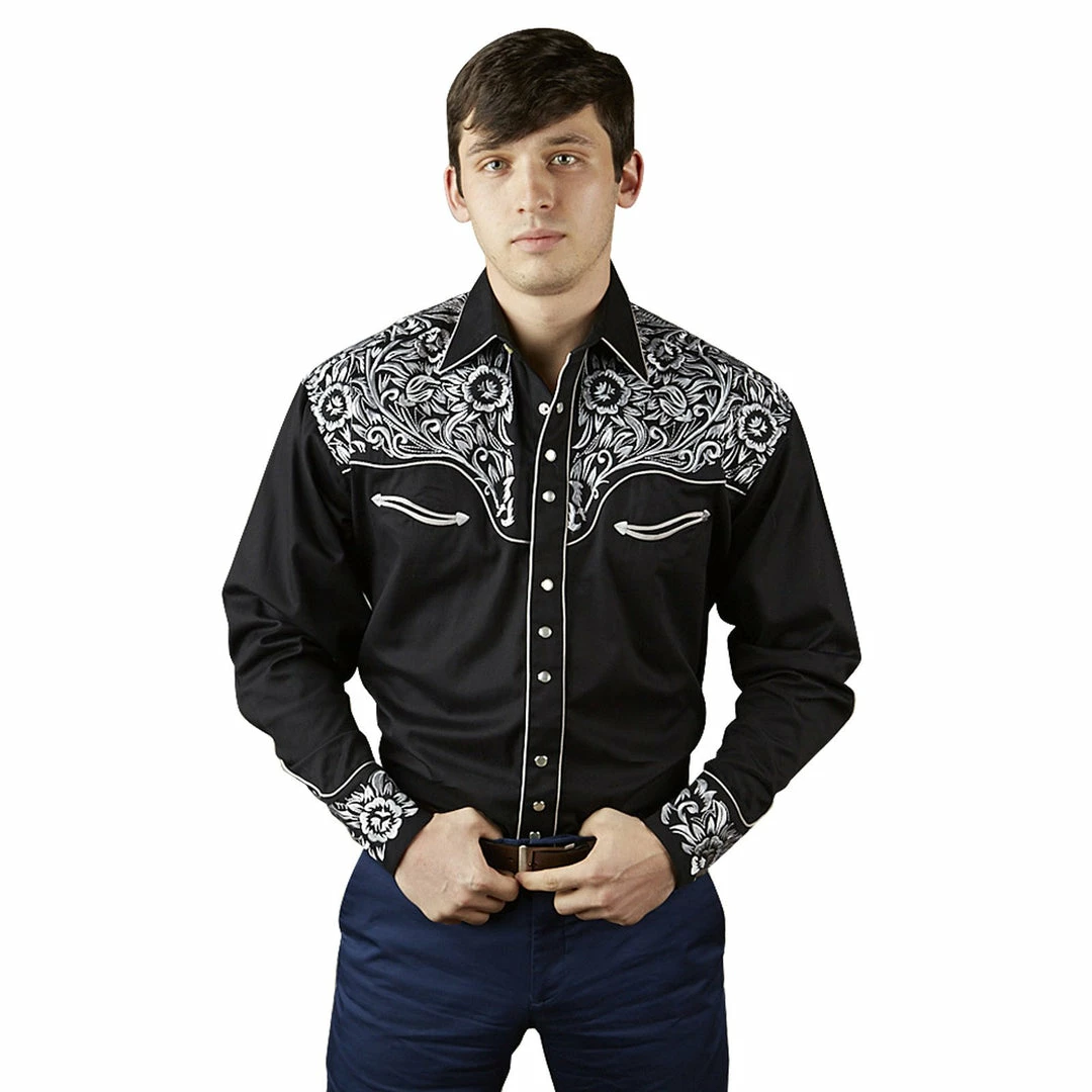 Fine Western embroidery and Rockmount … pure Americana. Rockmount’s embroidery is a tribute to classic floral saddle tooling on front, back and cuffs. The fabric is 100% cotton gabardine twill.