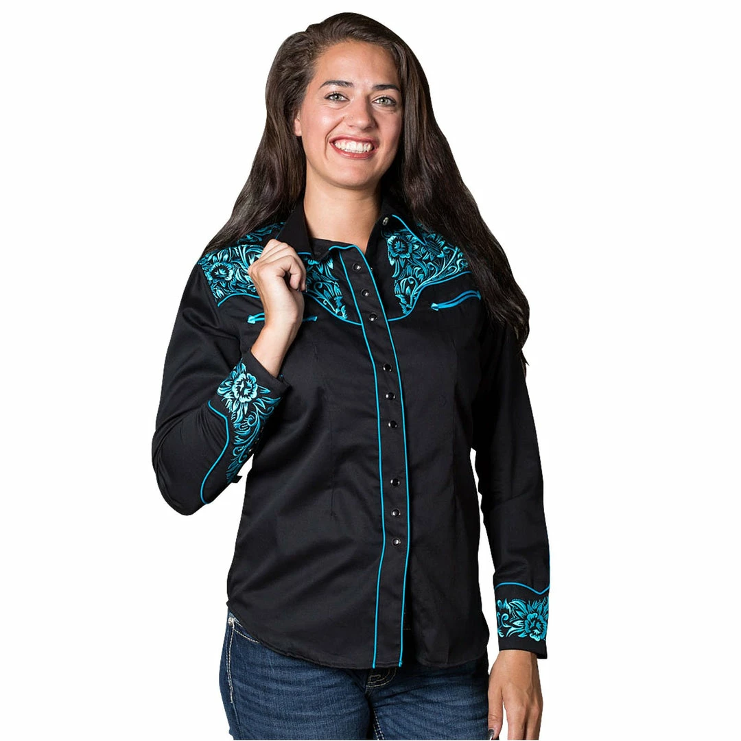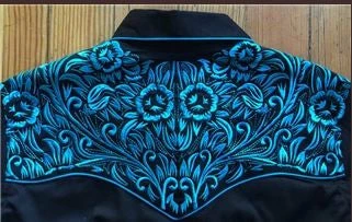 Fine Western embroidery and Rockmount … pure Americana. This embroidery is a tribute to classic floral saddle tooling on front, back and cuffs. The fabric is 100% cotton gabardine twill. This shirt has it all: top construction with piping, smile pockets and Rockmount’s signature cuffs.