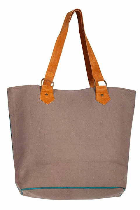 This southwest Mayan modern wool tote bag has a detailed front design. Suede leather handles have an “o”ing detail. Magnetic snap closure. Turquoise lining with one zip and two open inner pockets.