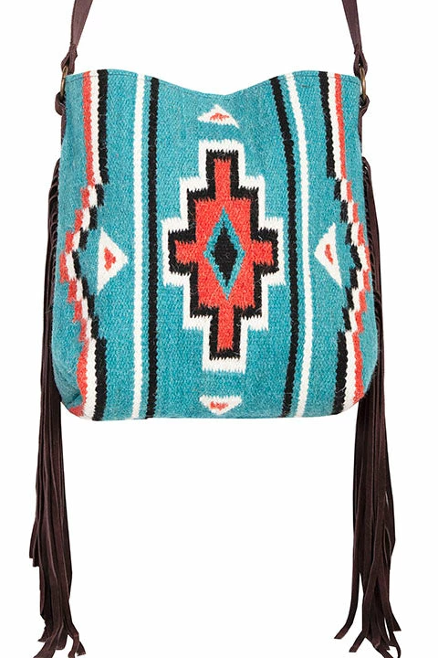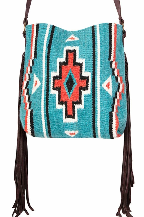 Wool shoulder bag with a gorgeous southwest inspired pattern features long leather fringe on both sides of the bag. It has a magnetic snap closure. Black lining with one zip and two open inner pockets.