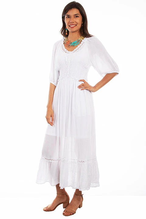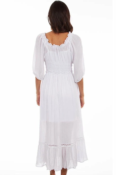 This romantic, flirty maxi dress charms beyond compare. It delights with lace around the scoop neck, down the bodice center ending at the waist. This 100% Peruvian cotton maxi dress features a wide dramatic smocking at the waist. The skirt is gathered at the waist in a ruffle. The hemline features a ruffle and horizontal lace band. Slip included. Belt not included.