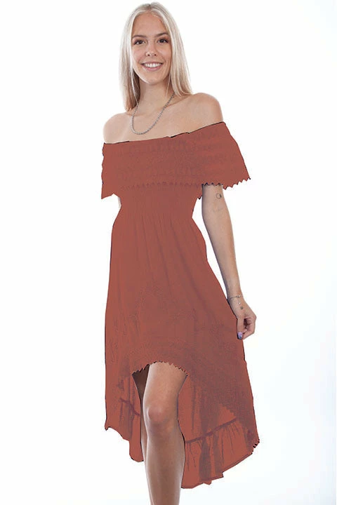 Romantic off the shoulder dress with its oversize lace collar is flattering on any figure. It features an elastic knit waist and a beautiful soutashe pattern on the lower front skirt. Finished with the same lacing pattern on the hemline.