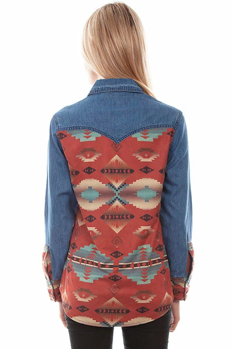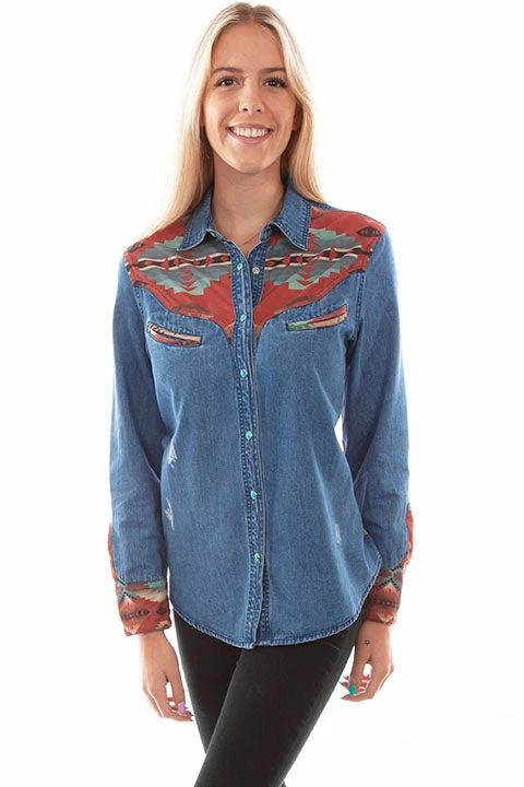 Denim shirt with microfiber and spandex insets. This denim shirt is also outstanding with its microfiber Aztec inspired pattern on the back and front yokes. It features a snap front with patterned smile pockets and cuffs.