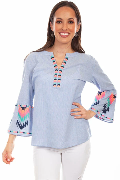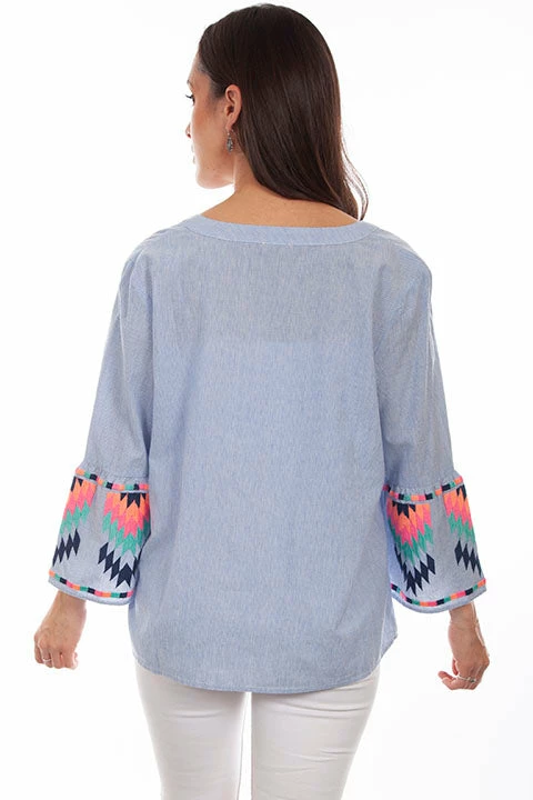 Pinstripe embroidered blouse is so simple to wear. Stunning Aztec inspired colorful embroidery is stylish. Features a keyhole collar with embroidered colorful bands running down the front. Sleeves feature an Aztec motif.