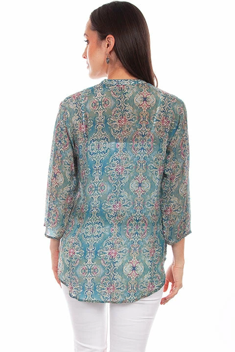 Like a vivid classic print pattern that this style displays, you’ll enjoy this gentle soft fabric. It features a button front closure, stand-up collar and 3/4 sleeves. Import.