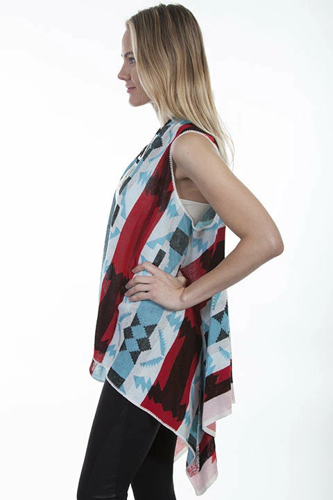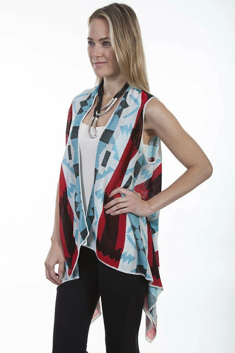 Fresh and eye catching, this “waterfall” multi colored vest drapes beautifully with a hi/lo effect. Great southwest look!.