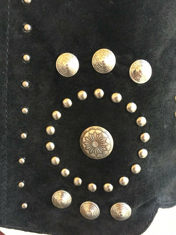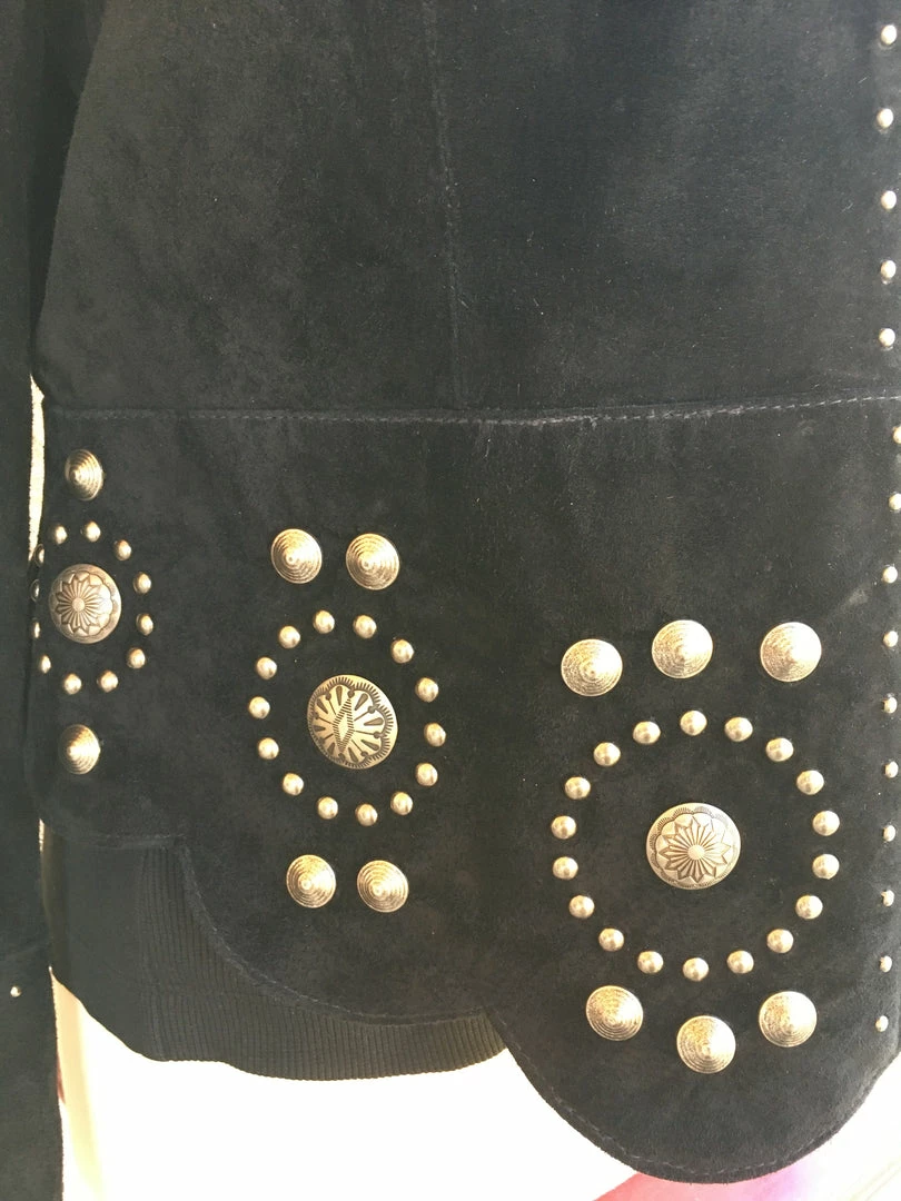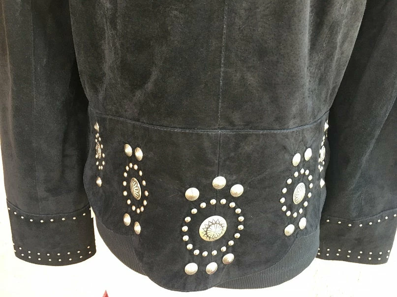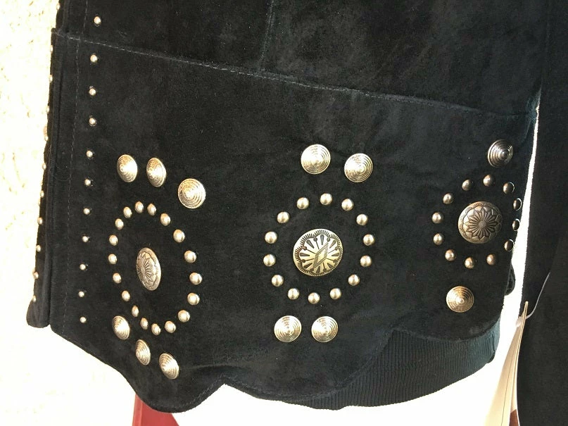 You’ll be styling in this fashion forward boar suede concho jacket with lavish decoations. Features a zip front closure with intricate concho and stud design that fits into the curved scalloped bottom hem. Stud detailing on cuffs, band collar and front zipper. Fully lined. Import.