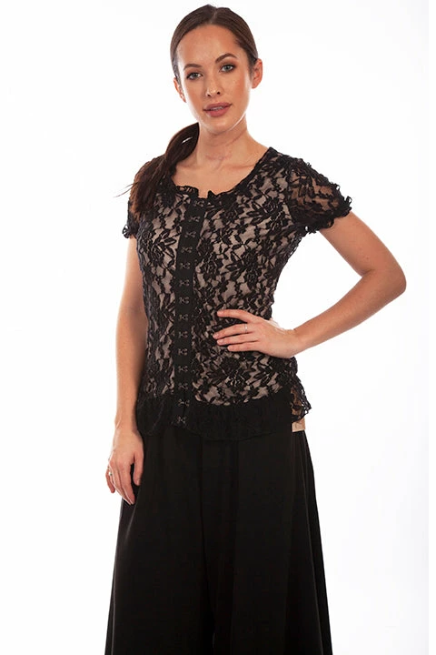Romantic lace delicate crochet pullover top features a hook & eye front closure that can be used or purely decorative. Fully lined in a contrast color emphasizing the feminine floral lace pattern. Features a ruffled hemline, scoop neck and short sleeves.