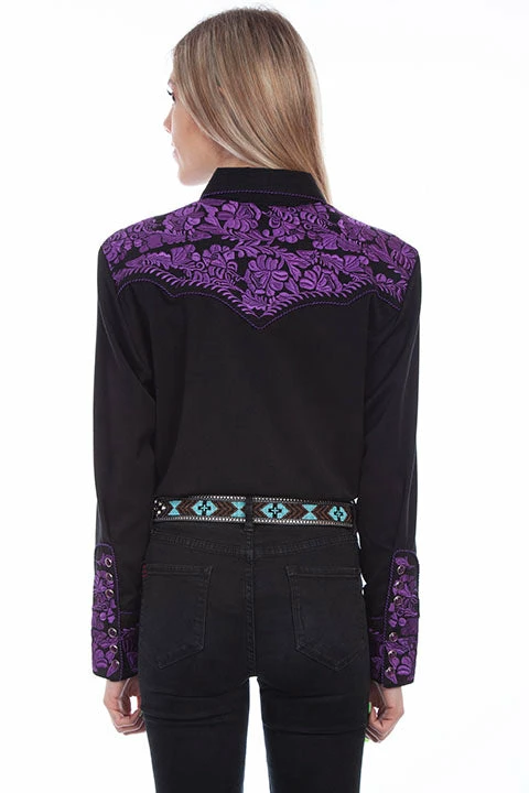 - Black body with elegant purple floral embroidered yokes and cuffs
