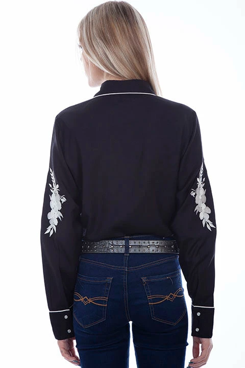 This contrast black & white western shirt features a poly/rayon blend and has a snap front and cuff closures. The white floral embroidery is placed on the collar, front yokes and upper sleeves.