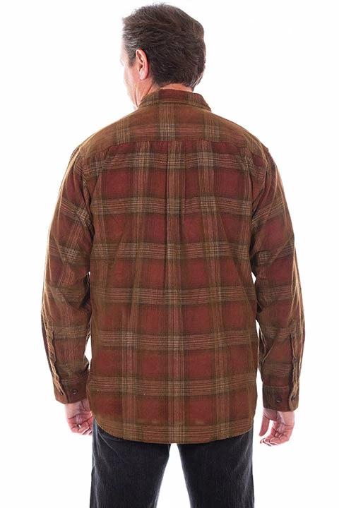 This yarn dyed sherpa lined Outdoor Corduroy Plaid shirt jacket features a hip casual pattern. 100% cotton. One chest pocket with button closure.