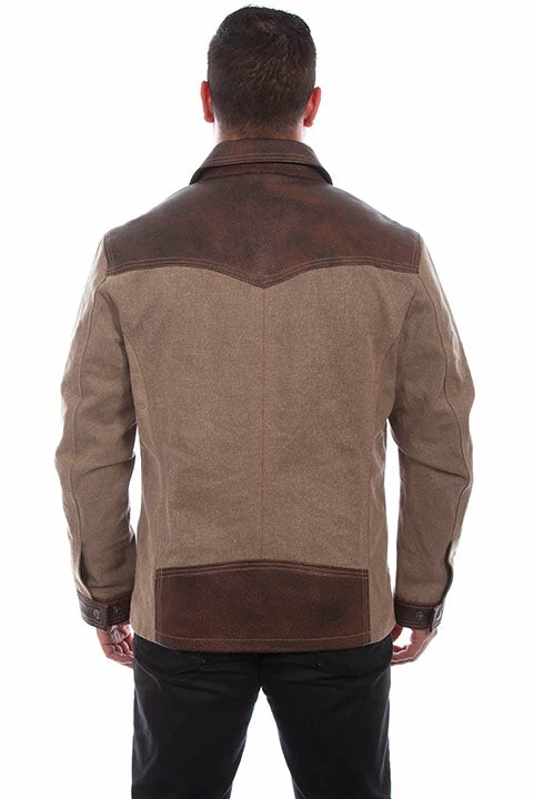 This cool casual jacket adds a touch of sophistication with its leather trim on the collar, front and back yokes, cuffs and pocket trim. The back features a lower center patch in leather. It features a zip front, point collar and two lower diagonal side entry pockets. The body of the jacket is a cotton canvas fabric and is fully lined.