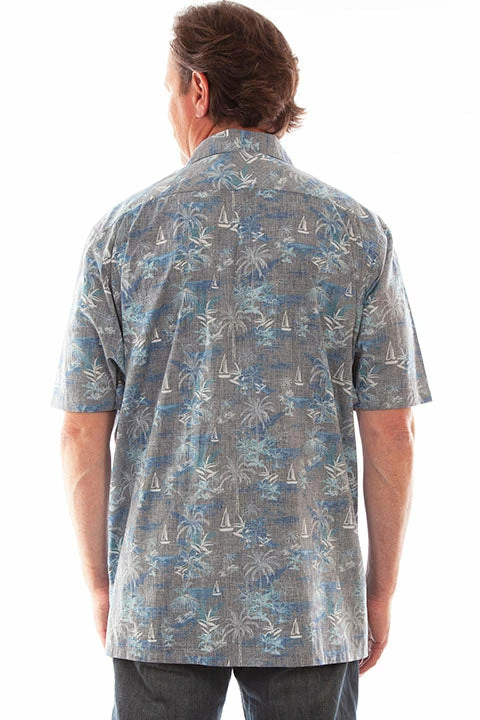 - Grey Hawaiian Print featuring palm trees and sail boats