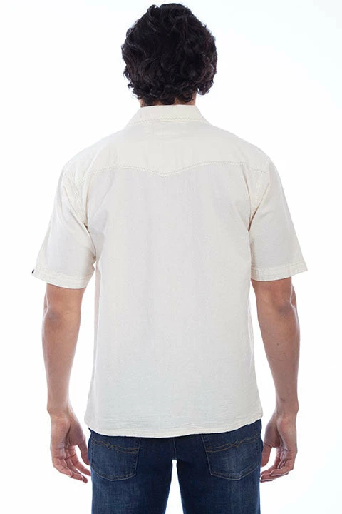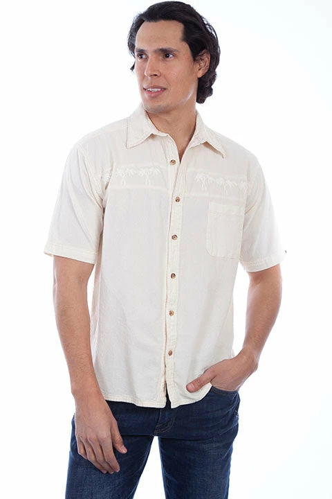 Palm Tree embroidered shirt features a horizontal band of tonal embroidered palm trees. Wear a tourist attitude – I’m on Vacation – everyday. Button front shirt with point collar and left chest pocket.