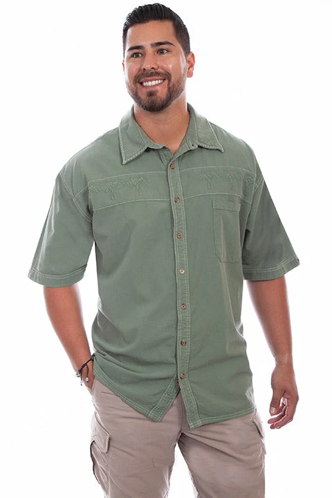 Palm Tree embroidered shirt features a horizontal band of tonal embroidered palm trees. Wear a tourist attitude – I’m on Vacation – everyday. Button front shirt with point collar and left chest pocket.