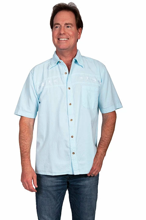 Embroidered shirt features a horizontal band of tonal embroidered palm trees, fish, and sailboats. Wear a tourist attitude – I’m on Vacation – everyday. Button front shirt with point collar and left chest pocket.