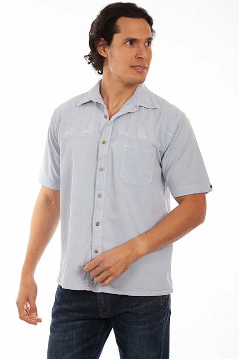 Sail Away embroidered shirt features a horizontal band of tonal embroidered sail boats. Wear a tourist attitude – I’m on Vacation – everyday. 100% Peruvian cotton, button front shirt with point collar and left chest pocket.