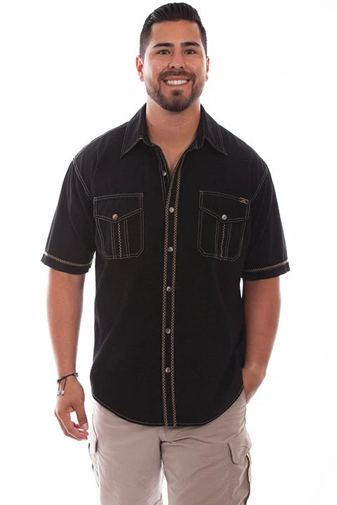 The Voyager shirt is suited for sailing and fishing. Features minimal embroidery in a contrast zig-zag stitch down the placket, sleeves and pockets. This button front has a point collar and two chest flap pockets with button closures and a center pleat with the zig-zag stitch embroidery.