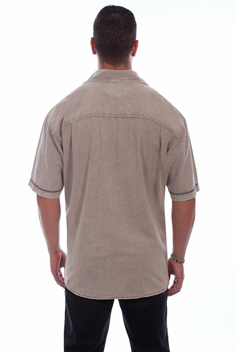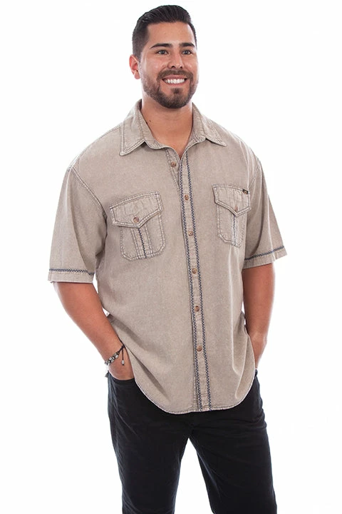 The Voyager shirt is suited for sailing and fishing. Features minimal embroidery in a contrast zig-zag stitch down the placket, sleeves and pockets. This button front has a point collar and two chest flap pockets with button closures and a center pleat with the zig-zag stitch embroidery.