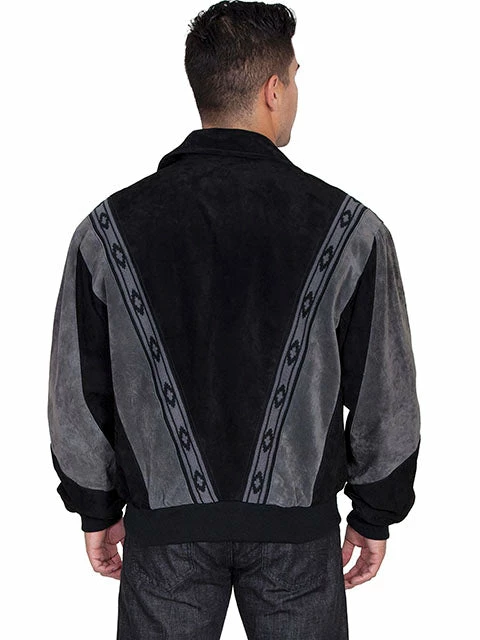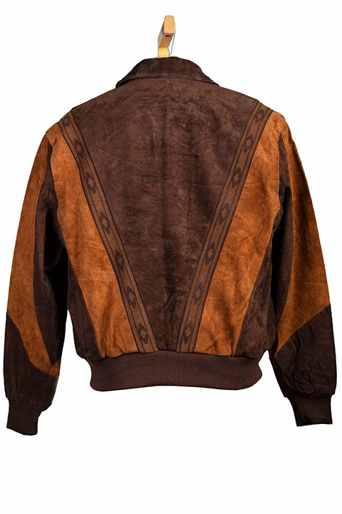 Two-toned boar suede rodeo jacket of black with cafe brown pattern trim. Southwestern motif with knit trim waist and cuffs. Zip front with two lower diagonal side entry welt pockets. Acetate lining with two inside chest pockets. Import.