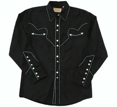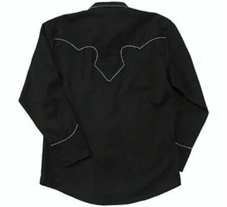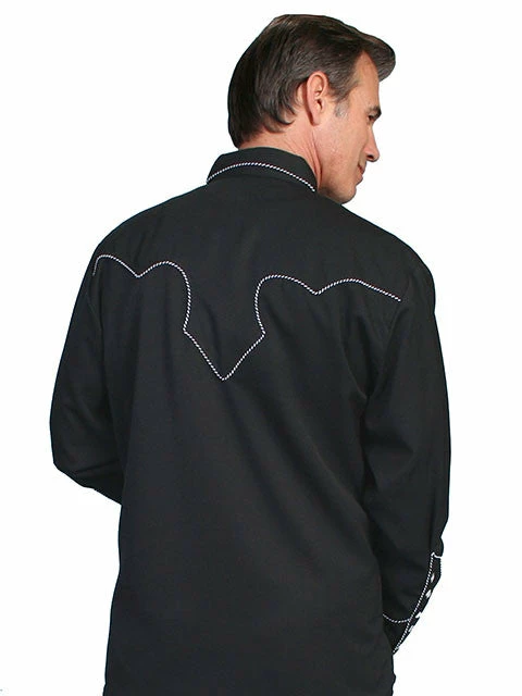 Classic, easy to wear Western style men’s shirt of black with white and black twisted trim outlining the front and back yokes, functional smile pockets.