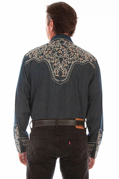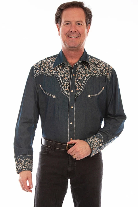 Men’s vintage inspired Western shirt features an embroidered two-tone floral scroll embroidery on yokes and cuffs. Candycane piping throughout.