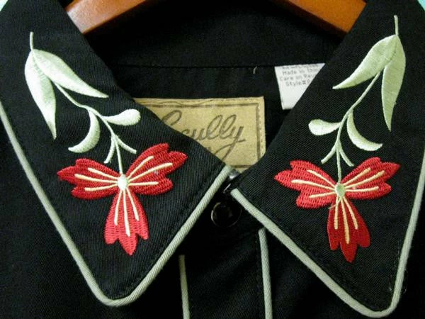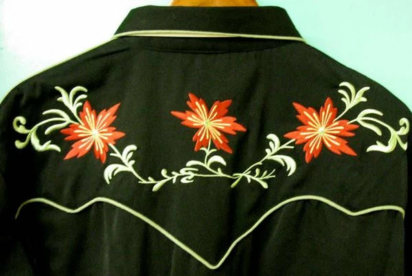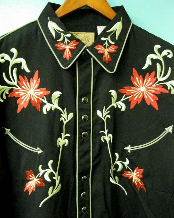 Unique men’s vintage style Western shirt with fancy vintage floral design detail on front and back yokes.