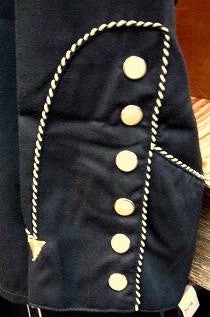 - Gold twisted trim around collar, front and back yokes, front placket, and cuffs