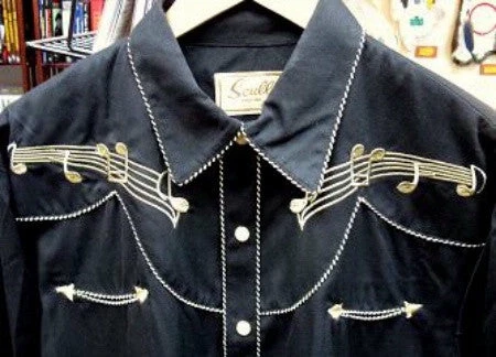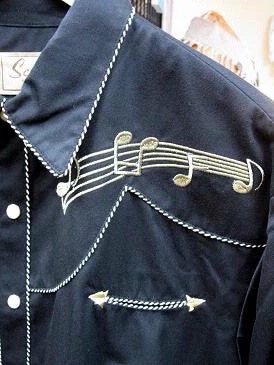 Unique men’s vintage style black Western shirt with a handsome music inspired design of gold notes on the front and back yokes.