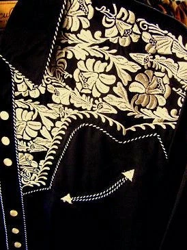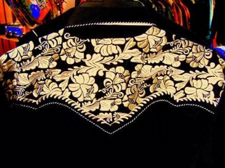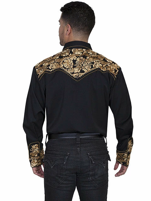 If you are a fan of Scully’s shirts, this one will be familiar to you as it is one of their most popular styles and is offered in a variety of color combinations. Handsome color combination of black body with stunning gold floral embroidered yokes and cuffs.