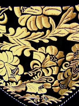 - Black body with elegant gold floral embroidered yokes and cuffs