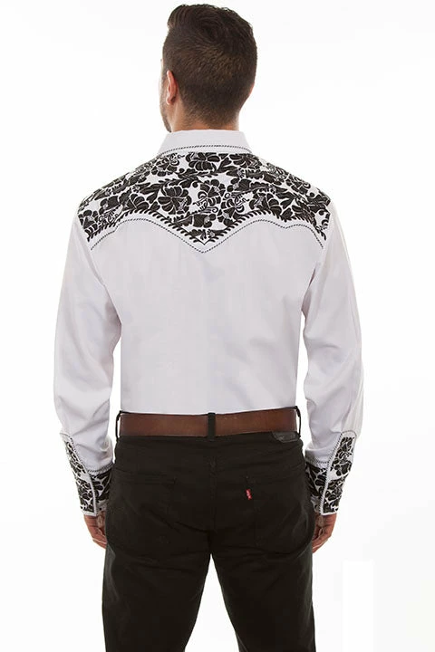 If you are a fan of Scully’s shirts, this one will be familiar to you as it is one of their most popular styles and is offered in a variety of color combinations. Handsome color combination of white body with elegant black floral embroidered yokes and cuffs.