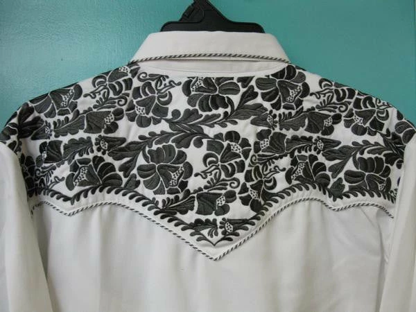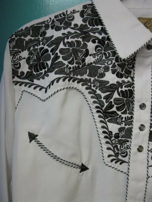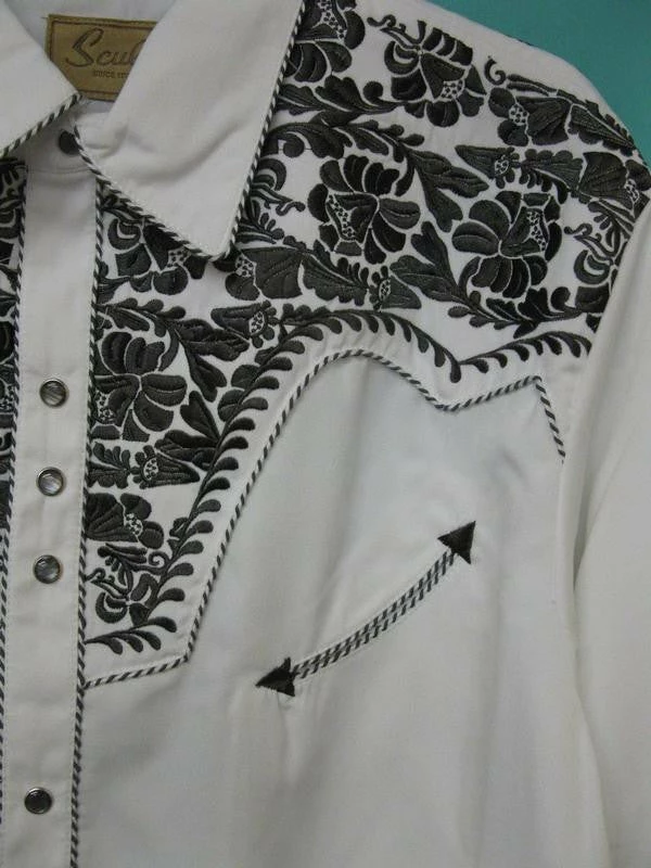 If you are a fan of Scully’s shirts, this one will be familiar to you as it is one of their most popular styles and is offered in a variety of color combinations. Color combination of white body with elegant pewter embroidered yokes and cuffs.